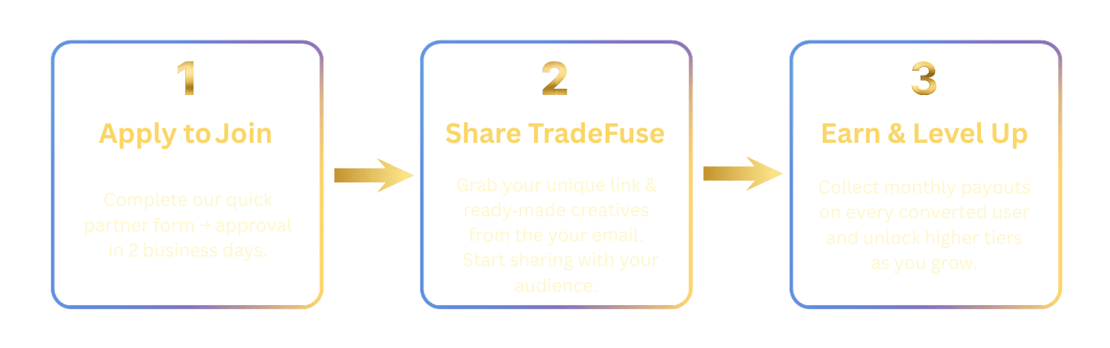 Once you generate $1000 in revenue for us as a Tier 1 Partner, you can apply to our Tier 2 Partner Program, where your referral link is good for life + custom rewards from TradeFuse! Tier 3 is $10,000+ and maxed-out rewards – 35% commissions, lifetime referrals, and more custom rewards.